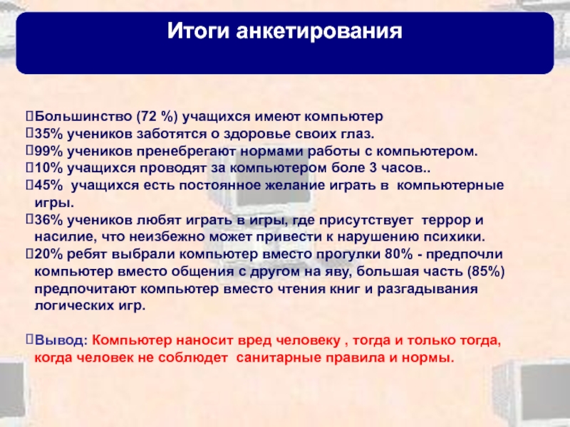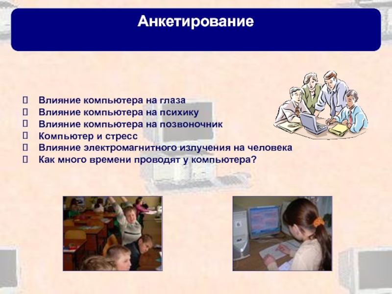 Провести анкетирование с целью выявления вреда компьютера на человека.
