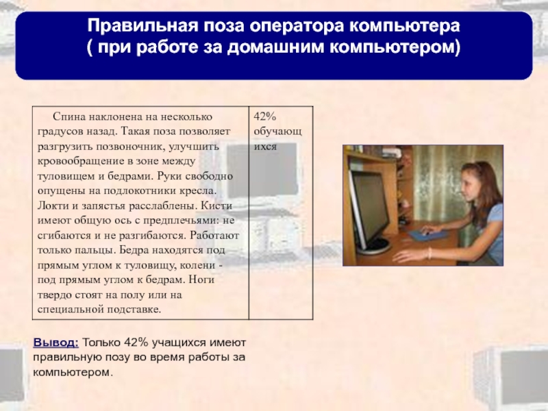 42% учащихся имеют правильную позу во время работы за компьютером.