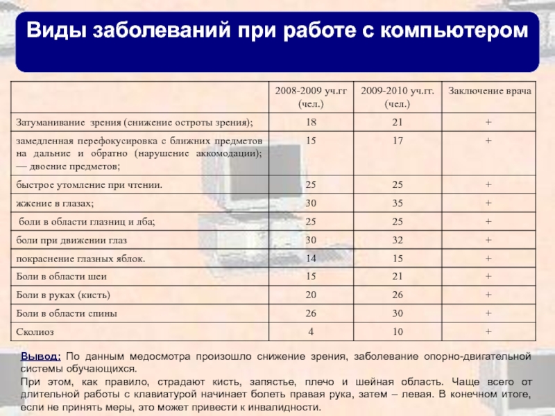 Слайд 30Виды заболеваний при работе с компьютером