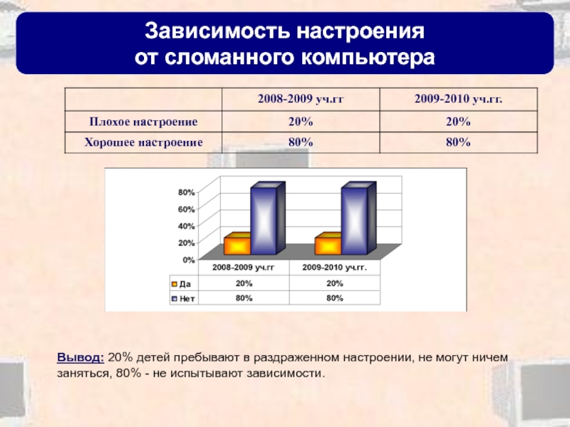 20% ребят выбрали компьютер вместо прогулки 80% - предпочли компьютер вместо общения с другом на яву, большая часть (85%) предпочитают компьютер вместо чтения книг и разгадывания логических игр.