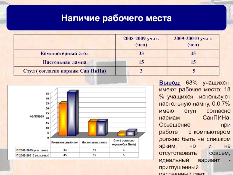 используют настольную лампу, 0,0,7% имею стул согласно нармам СанПИНа. Освещение при работе с компьютером должно быть не слишком ярким, но и не отсутствовать совсем, идеальный вариант - приглушенный рассеянный свет.