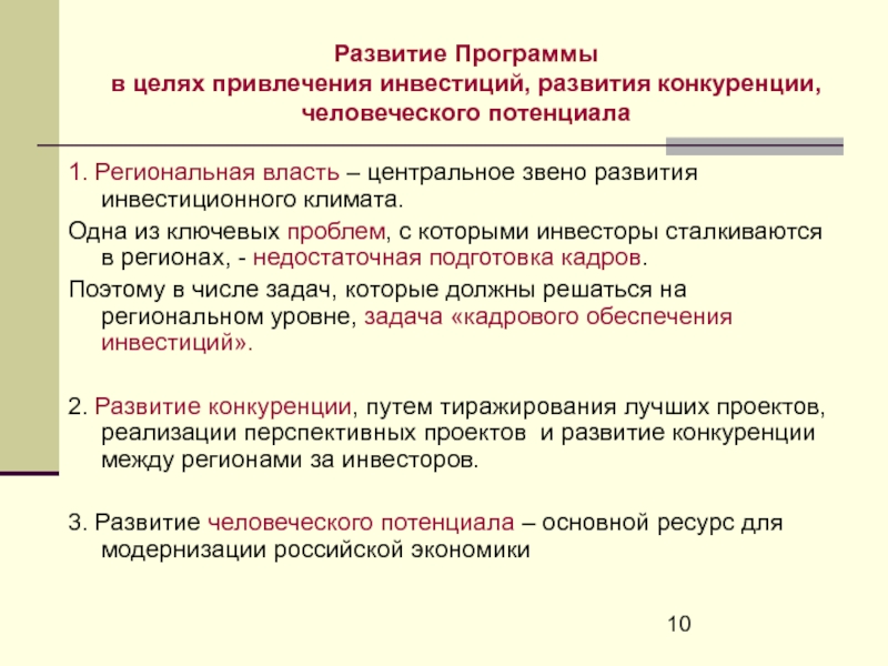 благоприятного инвестиционного климата в регионах, конкуренция за инвесторов, развитие человеческого потенциала;