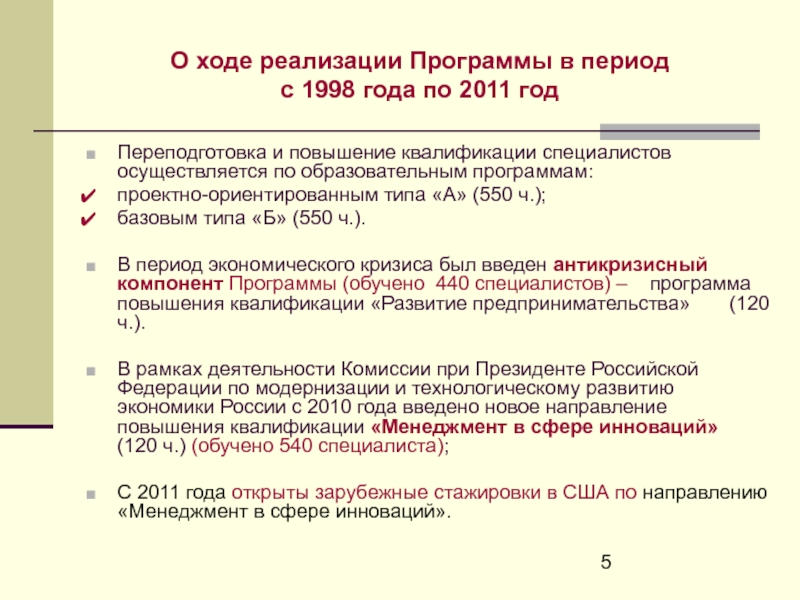В период экономического кризиса был введен антикризисный компонент Программы (обучено 440 специалистов) – программа повышения квалификации «Развитие предпринимательства» (120 ч.).