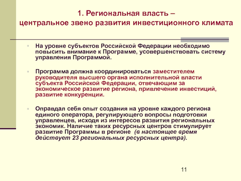 Принятие региональных программ улучшения инвестиционного климата и мониторинг их реализации;
