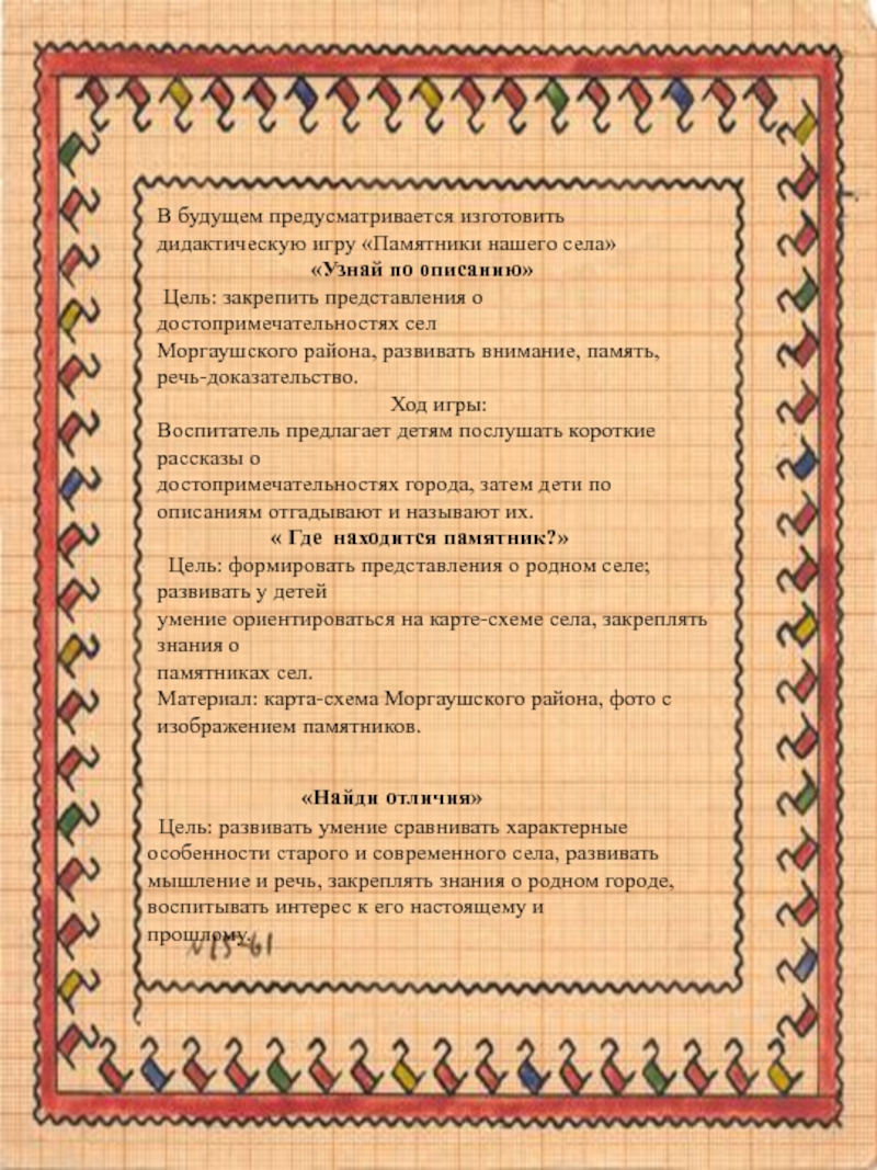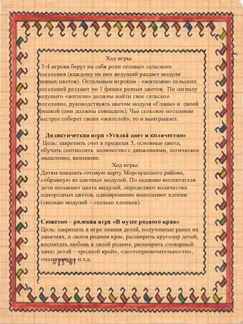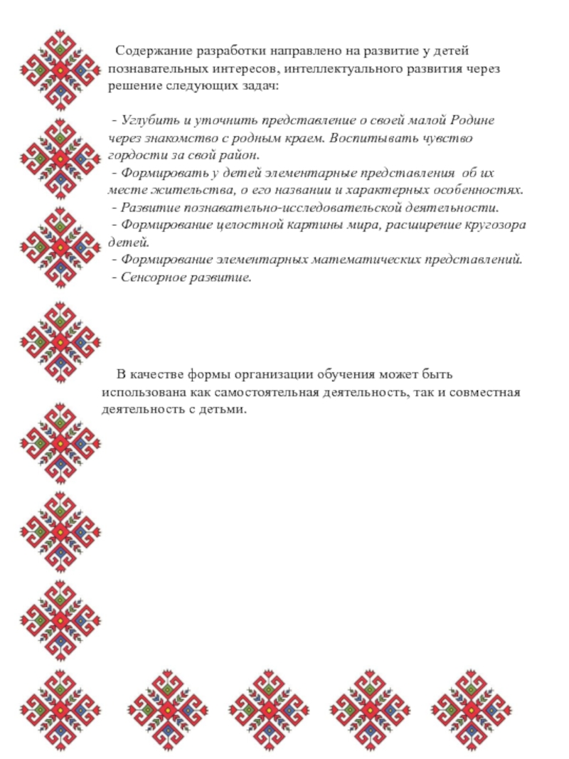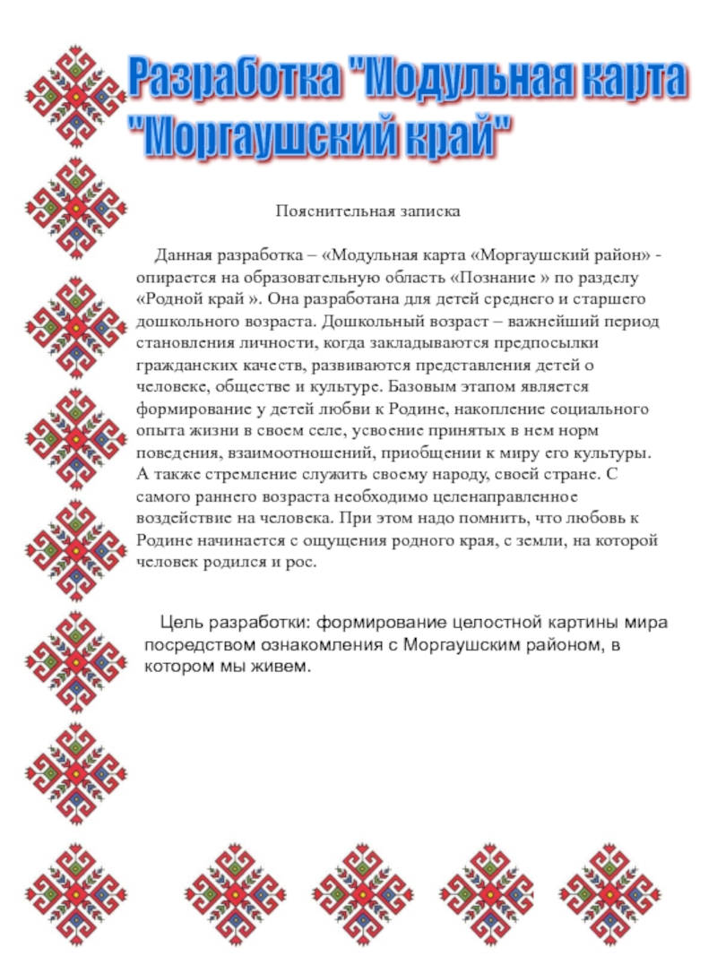 Данная разработка – «Модульная карта «Моргаушский район» - опирается на образовательную область «Познание » по разделу «Родной край ». Она разработана для детей среднего и старшего дошкольного возраста. Дошкольный возраст – важнейший период становления личности, когда закладываются предпосылки гражданских качеств, развиваются представления детей о человеке, обществе и культуре. Базовым этапом является формирование у детей любви к Родине, накопление социального опыта жизни в своем селе, усвоение принятых в нем норм поведения, взаимоотношений, приобщении к миру его культуры. А также стремление служить своему народу, своей стране. С самого раннего возраста необходимо целенаправленное воздействие на человека. При этом надо помнить, что любовь к Родине начинается с ощущения родного края, с земли, на которой человек родился и рос.