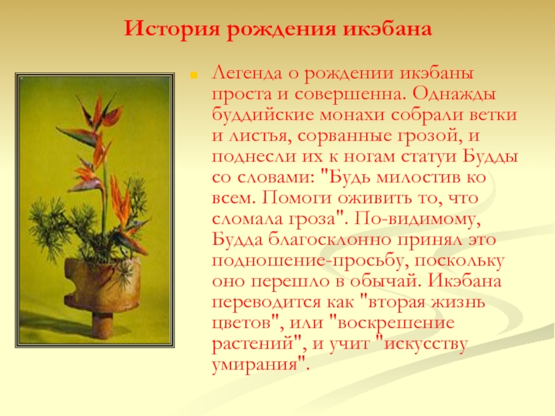 монахи собрали ветки и листья, сорванные грозой, и поднесли их к ногам статуи Будды со словами: "Будь милостив ко всем. Помоги оживить то, что сломала гроза". По-видимому, Будда благосклонно принял это подношение-просьбу, поскольку оно перешло в обычай. Икэбана переводится как "вторая жизнь цветов", или "воскрешение растений", и учит "искусству умирания".
