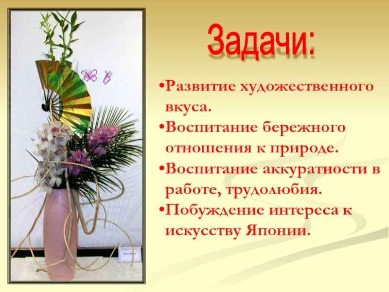 Являясь прекрасным средством эстетического воспитания, искусство аранжировки цветов вовлекает людей в сферу самодеятельного творчества, дает прекрасную возможность для создания более красивой, разумной и приятной жизни.