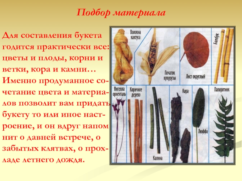 корни и ветки, кора и камни… Именно продуманное со- четание цвета и материа- лов позволит вам придать букету то или иное наст- роение, и он вдруг напом нит о давней встрече, о забытых клятвах, о прох- ладе летнего дождя.