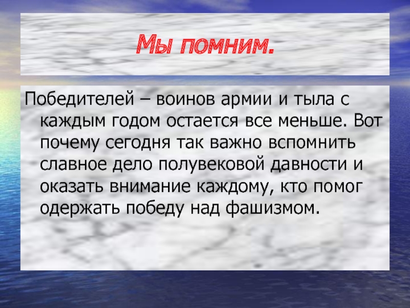 все меньше. Вот почему сегодня так важно вспомнить славное дело полувековой давности и оказать внимание каждому, кто помог одержать победу над фашизмом.
