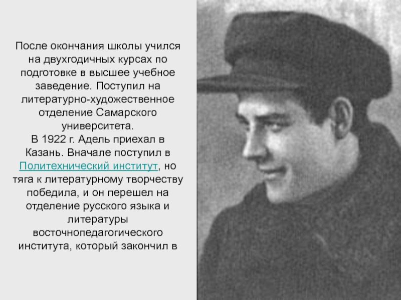 Здесь он учился в русской школе. В 1919 г. Адель поступил в трудовую школу на станции Кряж близ Самары.
