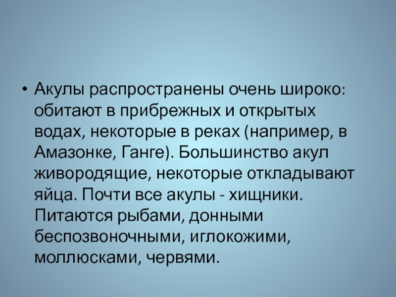 в реках (например, в Амазонке, Ганге). Большинство акул живородящие, некоторые откладывают яйца. Почти все акулы - хищники. Питаются рыбами, донными беспозвоночными, иглокожими, моллюсками, червями.