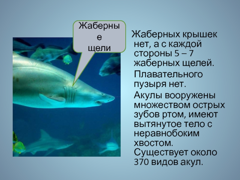Акулы вооружены множеством острых зубов ртом, имеют вытянутое тело с неравнобоким хвостом. Существует около 370 видов акул.