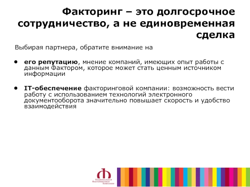 Слайд 5Факторинг – это долгосрочное сотрудничество, а не единовременная сделка