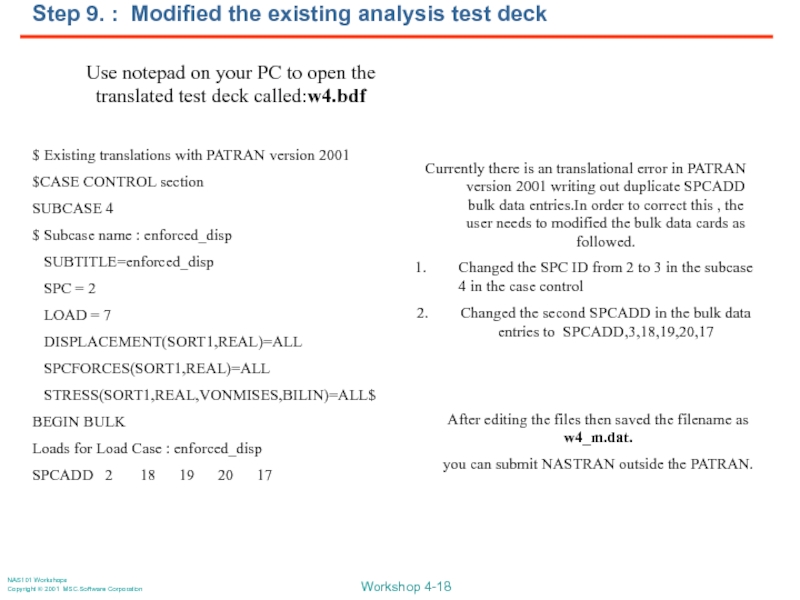 Currently there is an translational error in PATRAN version 2001 writing out duplicate SPCADD bulk data entries.In order to correct this , the user needs to modified the bulk data cards as followed.