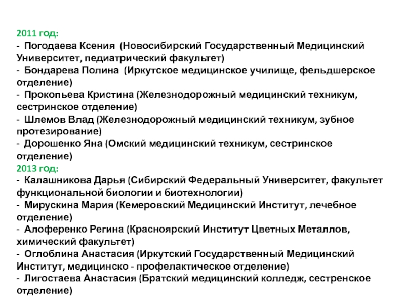 - Оглоблина Анастасия (Иркутский Государственный Медицинский Институт, медицинско - профелактическое отделение)