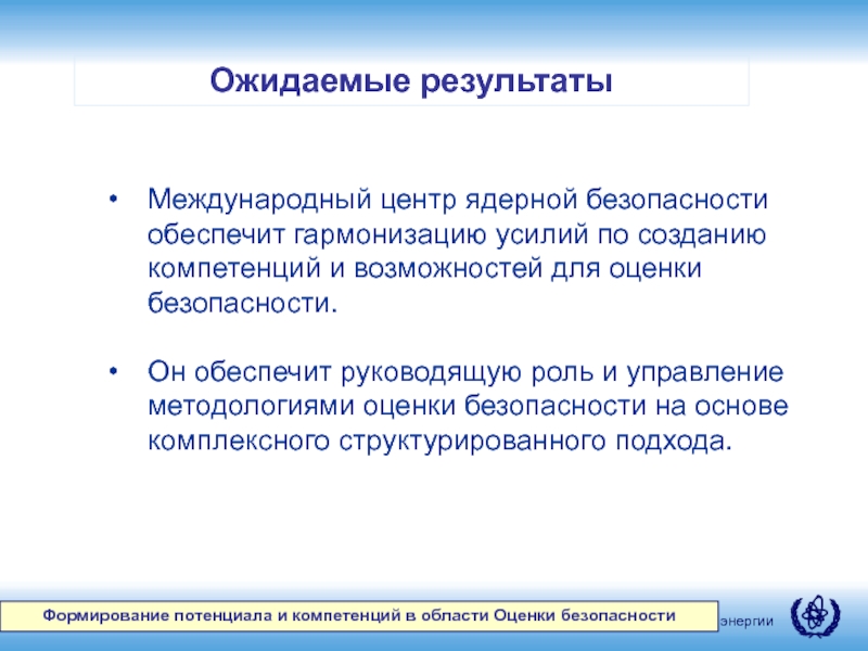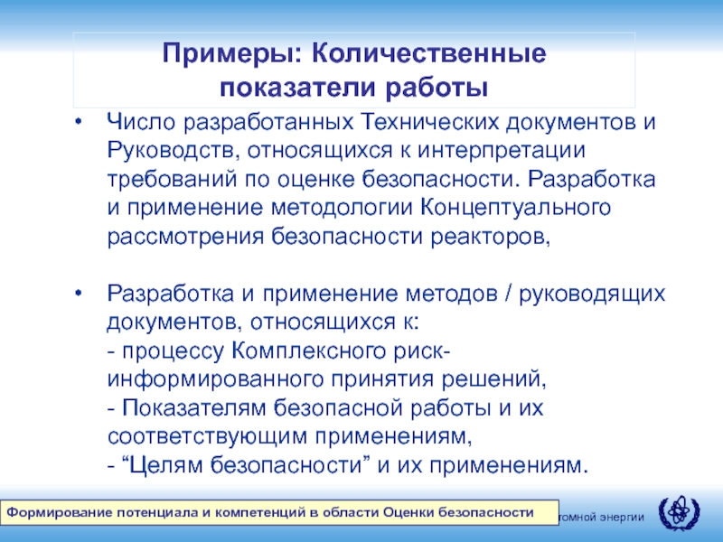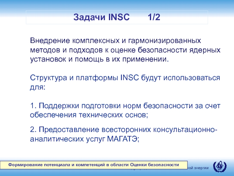 Внедрение комплексных и гармонизированных методов и подходов к оценке безопасности ядерных установок и помощь в их применении.