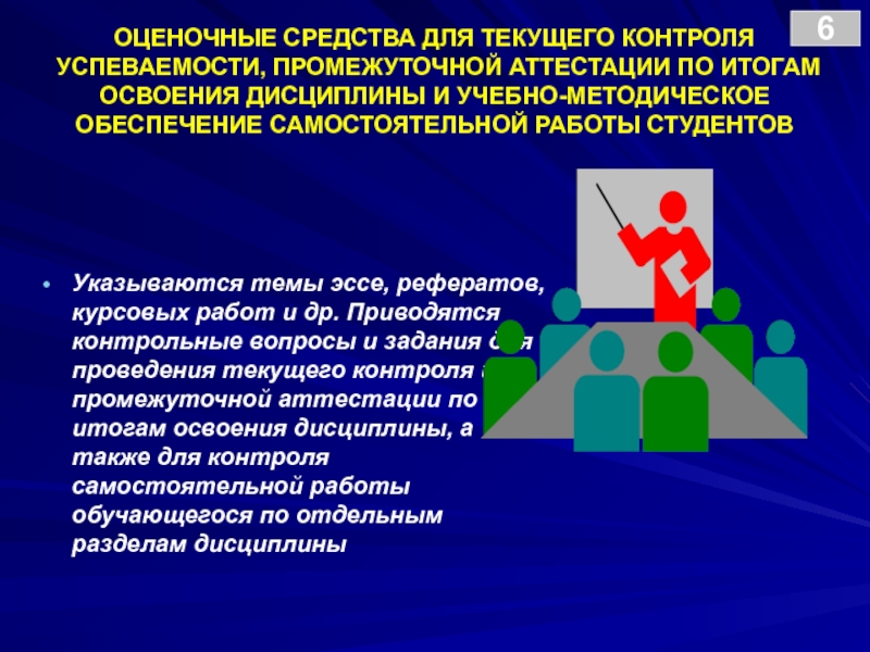 Указываются темы эссе, рефератов, курсовых работ и др. Приводятся контрольные вопросы и задания для проведения текущего контроля и промежуточной аттестации по итогам освоения дисциплины, а также для контроля самостоятельной работы обучающегося по отдельным разделам дисциплины