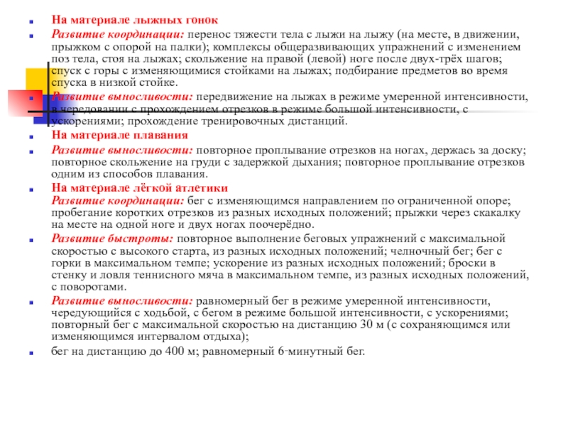 На материале лыжной подготовки: эстафеты в передвижении на лыжах, упражнения на выносливость и координацию.