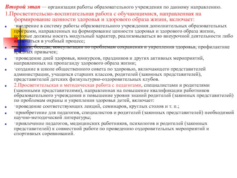 Слайд 13Второй этап — организация работы образовательного учреждения по данному направлению.