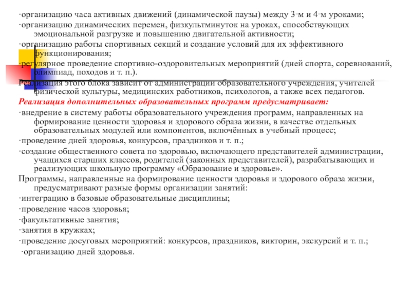 ·внедрение в систему работы образовательного учреждения дополнительных образовательных программ, направленных на формирование ценности здоровья и здорового образа жизни, которые должны носить модульный характер, реализовываться во внеурочной деятельности либо включаться в учебный процесс;