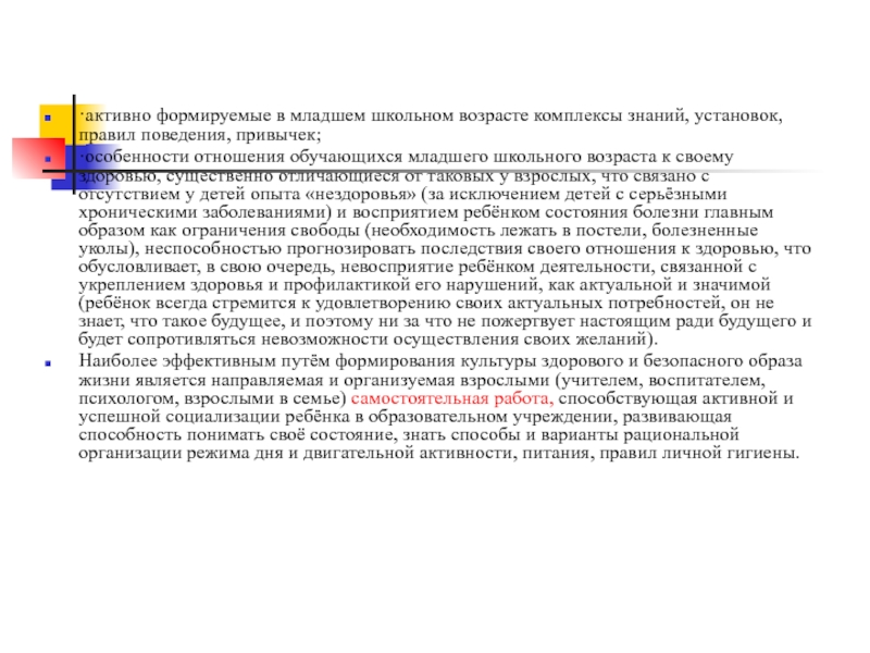 ·особенности отношения обучающихся младшего школьного возраста к своему здоровью, существенно отличающиеся от таковых у взрослых, что связано с отсутствием у детей опыта «нездоровья» (за исключением детей с серьёзными хроническими заболеваниями) и восприятием ребёнком состояния болезни главным образом как ограничения свободы (необходимость лежать в постели, болезненные уколы), неспособностью прогнозировать последствия своего отношения к здоровью, что обусловливает, в свою очередь, невосприятие ребёнком деятельности, связанной с укреплением здоровья и профилактикой его нарушений, как актуальной и значимой (ребёнок всегда стремится к удовлетворению своих актуальных потребностей, он не знает, что такое будущее, и поэтому ни за что не пожертвует настоящим ради будущего и будет сопротивляться невозможности осуществления своих желаний).