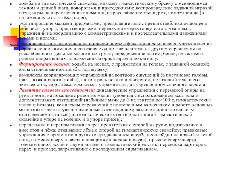 Слайд 7ходьба по гимнастической скамейке, низкому гимнастическому бревну с меняющимся темпом и
