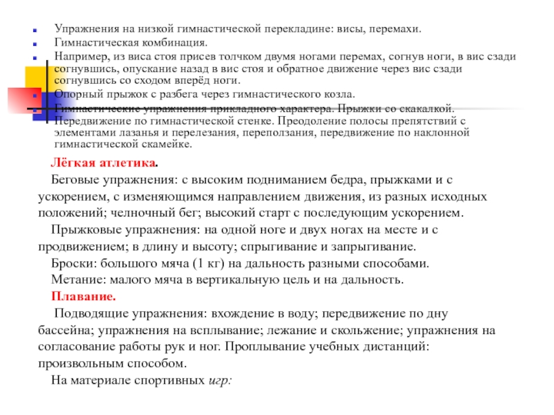 На материале лёгкой атлетики: прыжки, бег, метания и броски; упражнения на координацию, выносливость и быстроту.