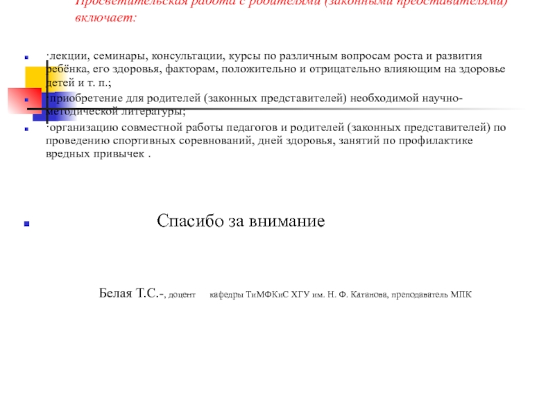 Слайд 17Просветительская работа с родителями (законными представителями) включает: