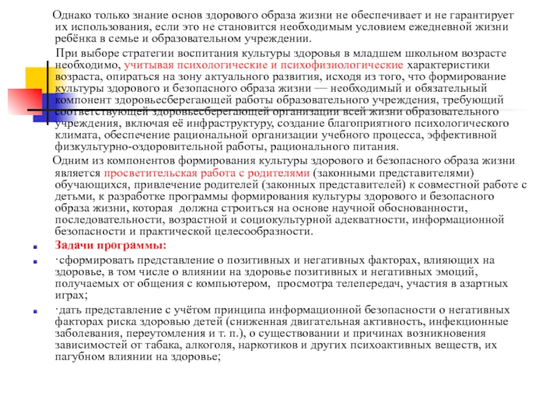 ·дать представление с учётом принципа информационной безопасности о негативных факторах риска здоровью детей (сниженная двигательная активность, инфекционные заболевания, переутомления и т. п.), о существовании и причинах возникновения зависимостей от табака, алкоголя, наркотиков и других психоактивных веществ, их пагубном влиянии на здоровье;