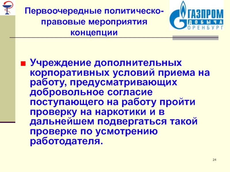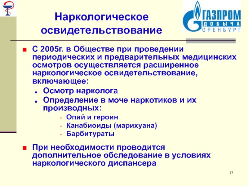 распространенности наркомании среди персонала ООО «Газпром добыча Оренбург» необходимо разработать и официально утвердить корпоративную политику по профилактике наркомании на рабочем месте.