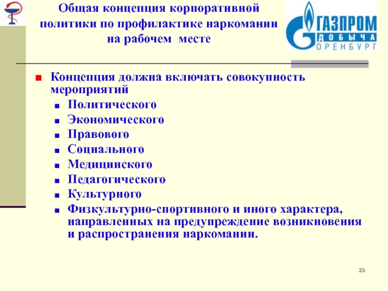 Слайд 23Общая концепция корпоративной политики по профилактике наркомании на рабочем месте