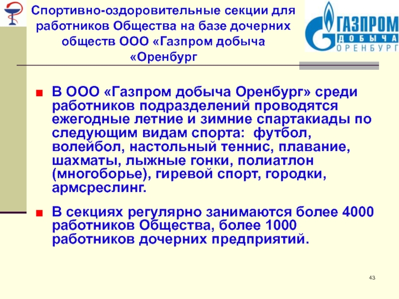 Слайд 43Спортивно-оздоровительные секции для работников Общества на базе дочерних обществ ООО «Газпром