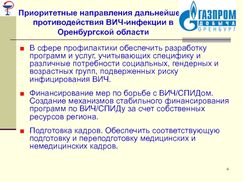 Слайд 9Приоритетные направления дальнейшего противодействия ВИЧ-инфекции в Оренбургской области
