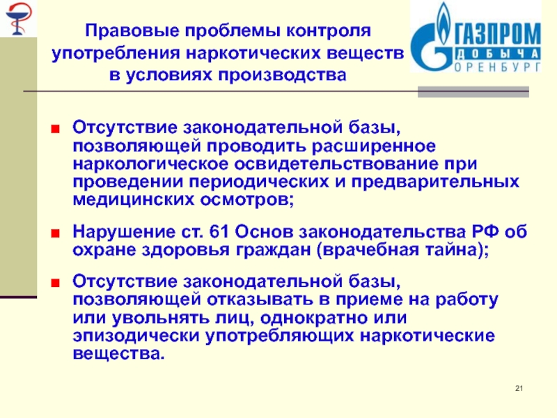 Слайд 21Правовые проблемы контроля употребления наркотических веществ в условиях производства