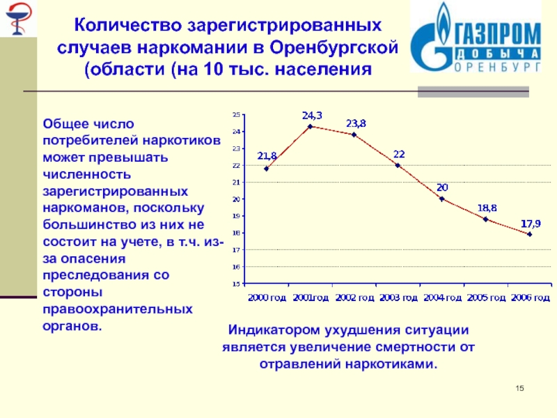 Слайд 15Количество зарегистрированных случаев наркомании в Оренбургской области (на 10 тыс. населения)