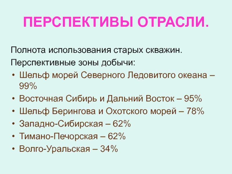 Газовая промышленность одна из самых динамичных развивающихся отраслей. В ближайшей перспективе лидерство Западной Сибири останется, но в дальнейшем существенная добыча будет осуществляться на шельфовых месторождениях Карского и Баренцева морей, а также в близи о. Сахалин.