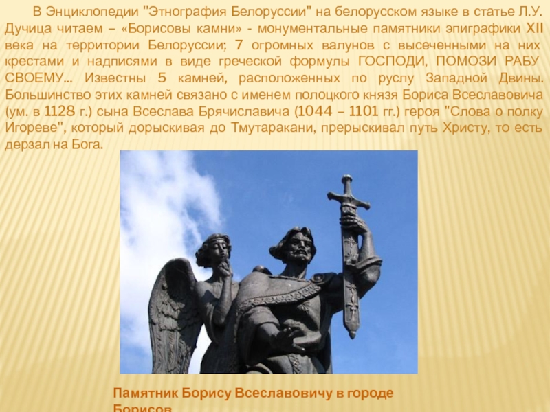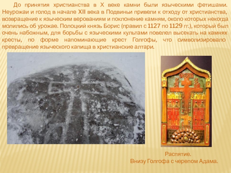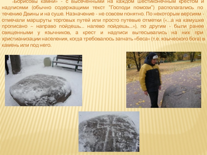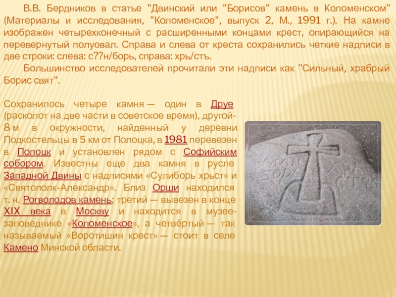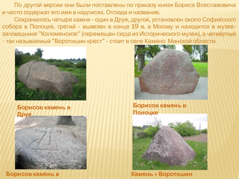 Сохранилось четыре камня — один в Друе (расколот на две части в советское время), другой- 8 м в окружности, найденный у деревни Подкостельцы в 5 км от Полоцка, в 1981 перевезен в Полоцк и установлен рядом с Софийским собором. Известны еще два камня в русле Западной Двины с надписями «Сулиборь хрьст» и «Святополк-Александр». Близ Орши находился т. н. Рогволодов камень; третий — вывезен в конце XIX века в Москву и находится в музее-заповеднике «Коломенское», а четвёртый — так называемый «Воротишин крест» — стоит в селе Камено Минской области.