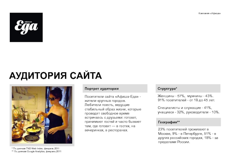 Женщины - 57%, мужчины - 43%. 91% посетителей - от 18 до 45 лет.