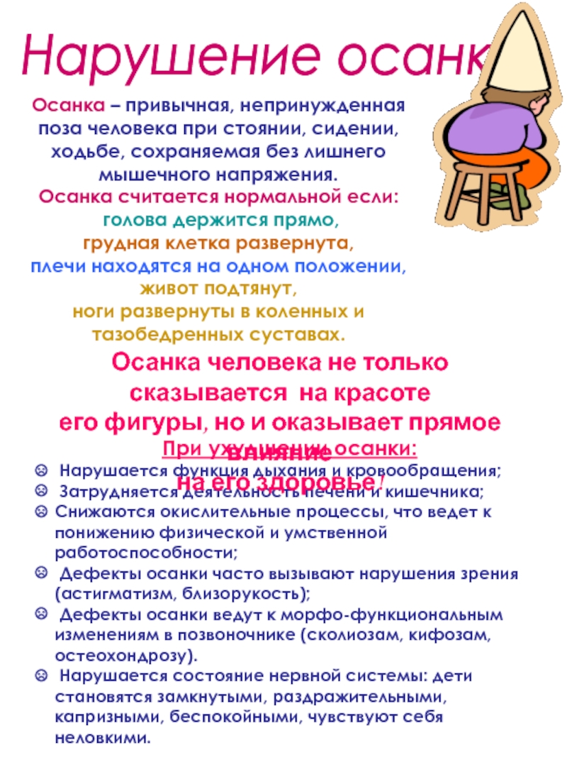 Дефекты осанки ведут к морфо-функциональным изменениям в позвоночнике (сколиозам, кифозам, остеохондрозу).
