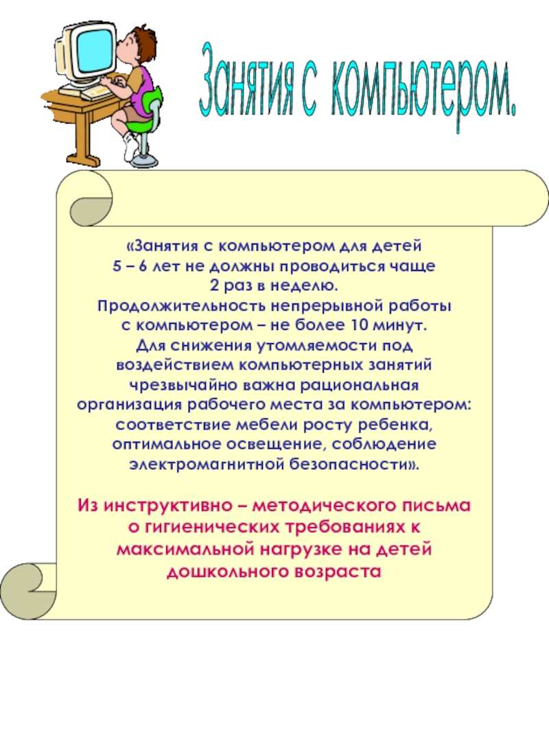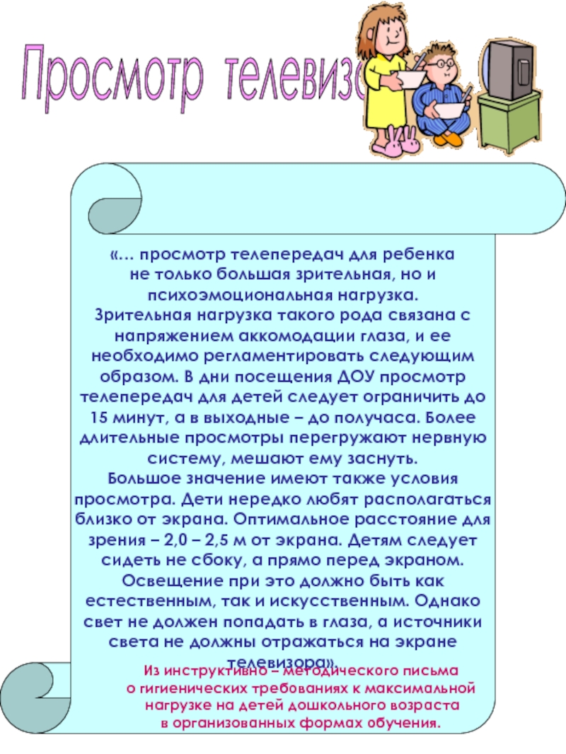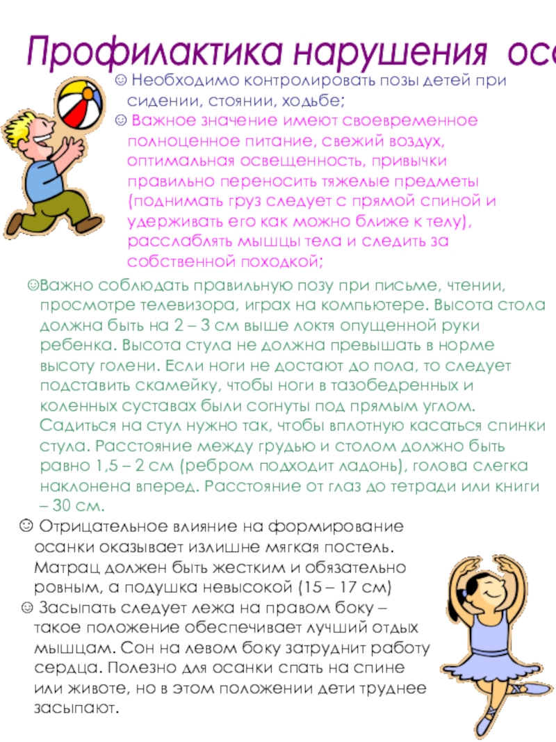 Важно соблюдать правильную позу при письме, чтении, просмотре телевизора, играх на компьютере. Высота стола должна быть на 2 – 3 см выше локтя опущенной руки ребенка. Высота стула не должна превышать в норме высоту голени. Если ноги не достают до пола, то следует подставить скамейку, чтобы ноги в тазобедренных и коленных суставах были согнуты под прямым углом. Садиться на стул нужно так, чтобы вплотную касаться спинки стула. Расстояние между грудью и столом должно быть равно 1,5 – 2 см (ребром подходит ладонь), голова слегка наклонена вперед. Расстояние от глаз до тетради или книги – 30 см.