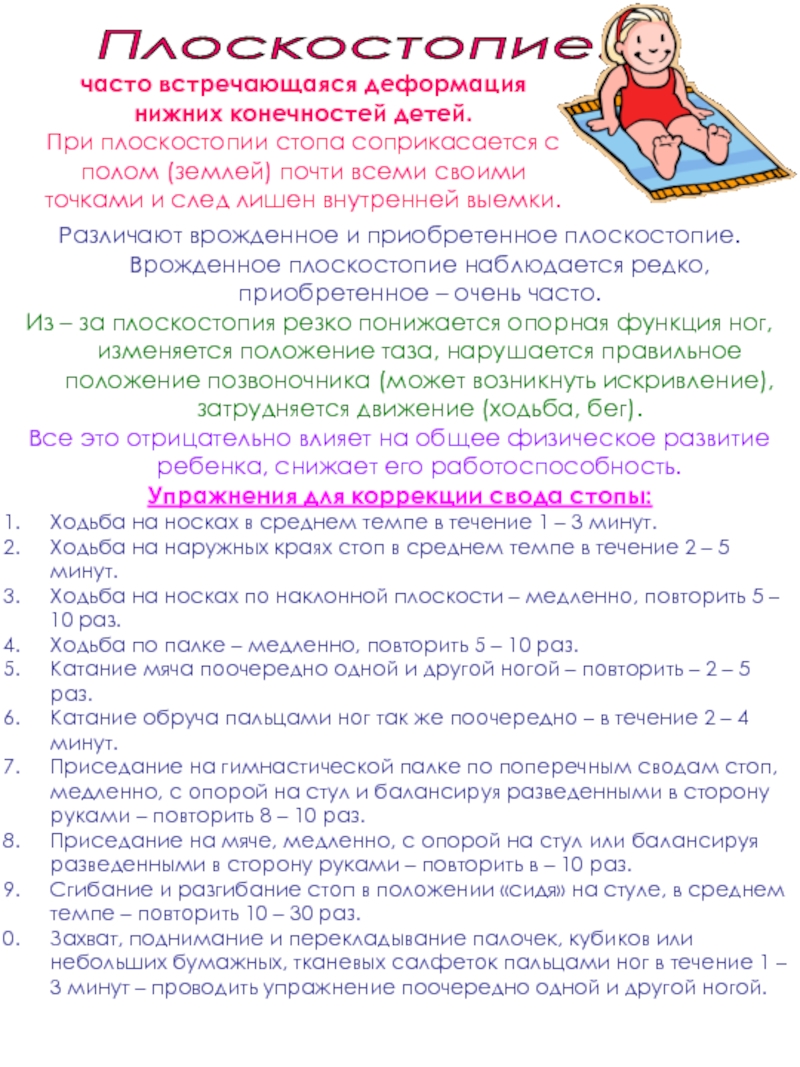 Различают врожденное и приобретенное плоскостопие. Врожденное плоскостопие наблюдается редко, приобретенное – очень часто.