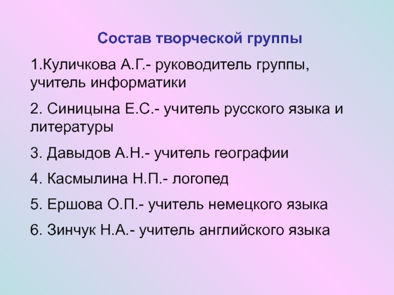 1.Куличкова А.Г.- руководитель группы, учитель информатики