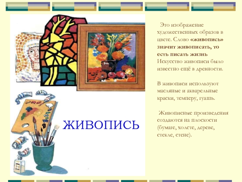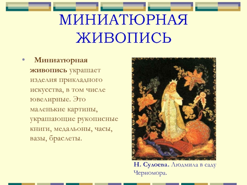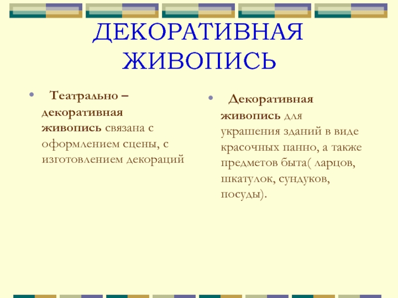 Декоративная живопись для украшения зданий в виде красочных панно, а также предметов быта( ларцов, шкатулок, сундуков, посуды).