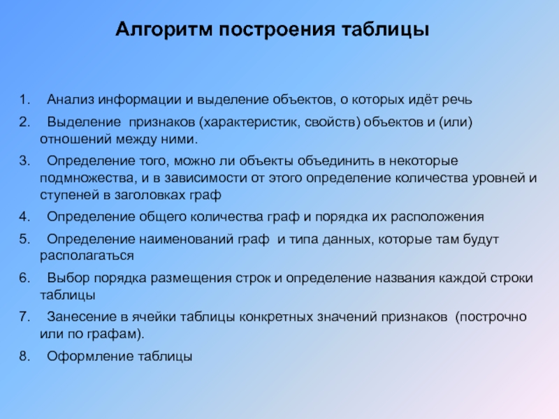 7. Занесение в ячейки таблицы конкретных значений признаков (построчно или по графам).