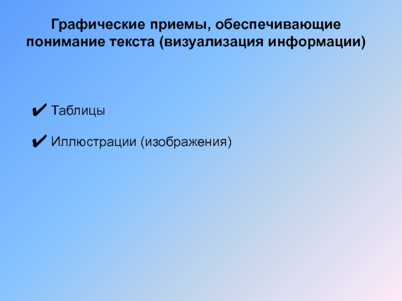 Слайд 24Графические приемы, обеспечивающие понимание текста (визуализация информации)