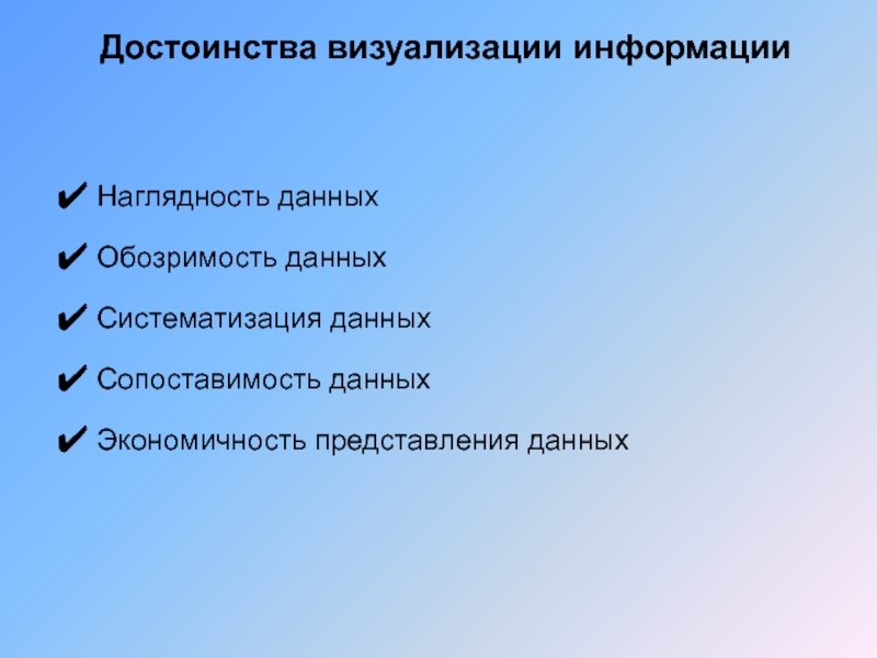 visualis зрительный) - процесс представления данных в виде изображения с целью максимального удобства их понимания пользователем. Это представление числовой и текстовой информации в виде таблиц, графиков, диаграмм, структурных схем, карт и т.д.