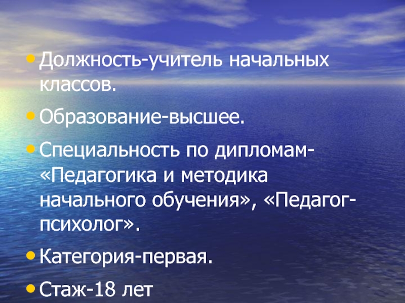 Специальность по дипломам-«Педагогика и методика начального обучения», «Педагог-психолог».