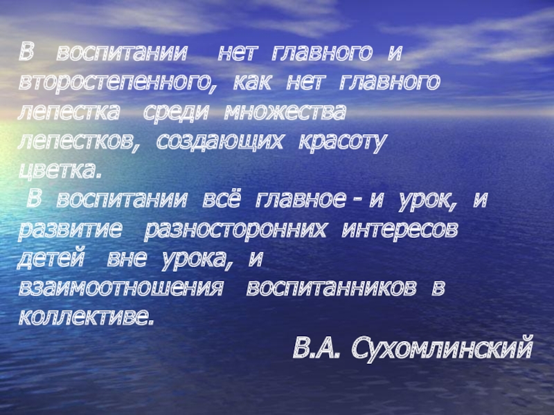 В  воспитании  всё  главное - и  урок,  и  развитие   разносторонних  интересов   детей   вне  урока,  и