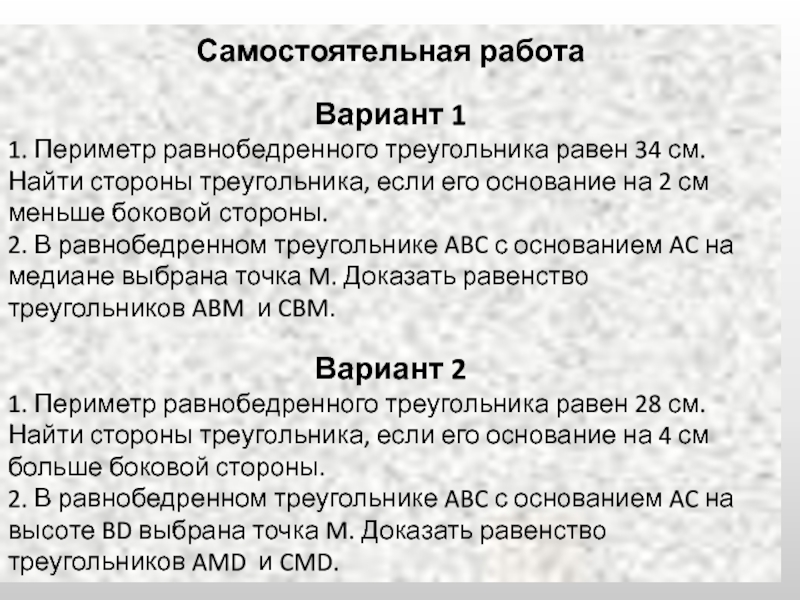 1) Пусть x см - боковая сторона треугольника, тогда основание x+4 (см). По условию задачи периметр треугольника равен 28 см, тогда