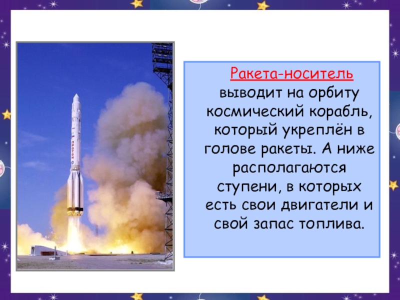 Слайд 15 Ракета-носитель выводит на орбиту космический корабль, который укреплён в голове ракеты.